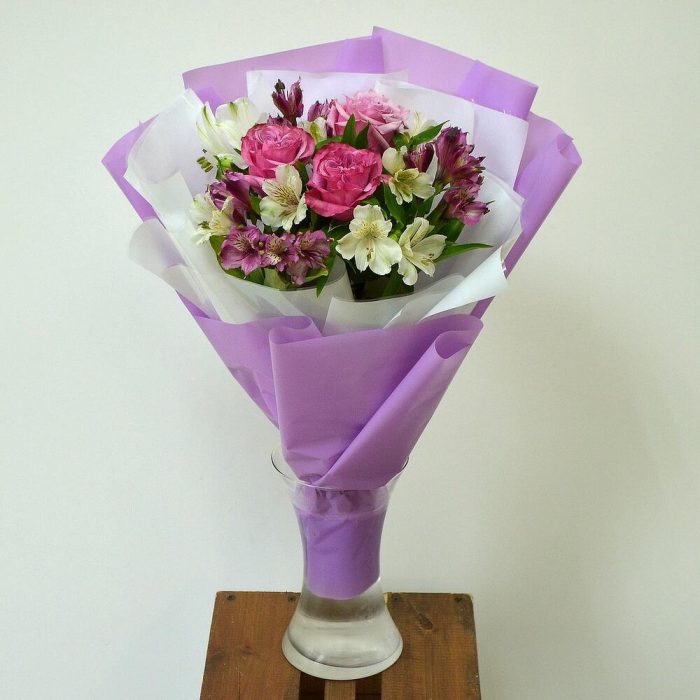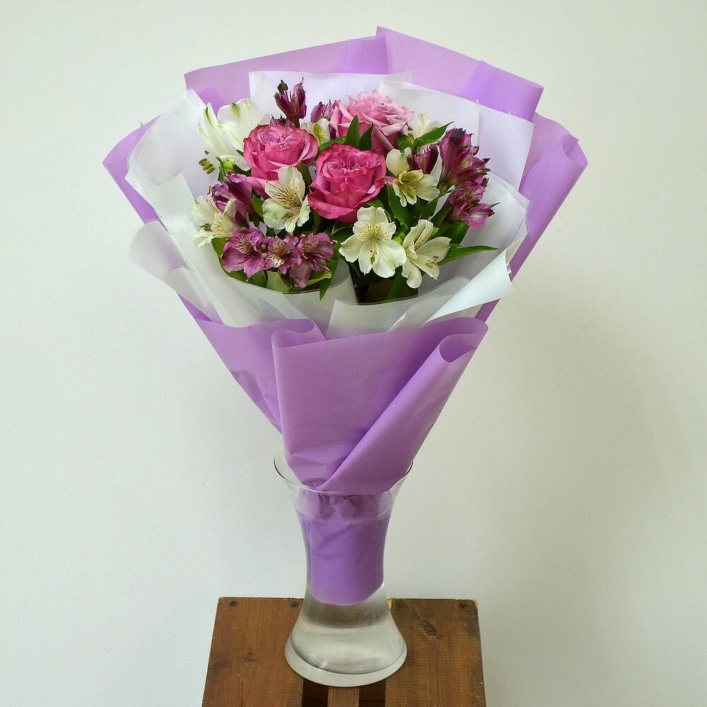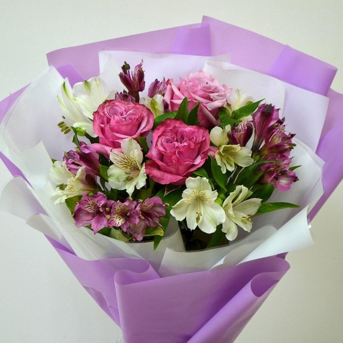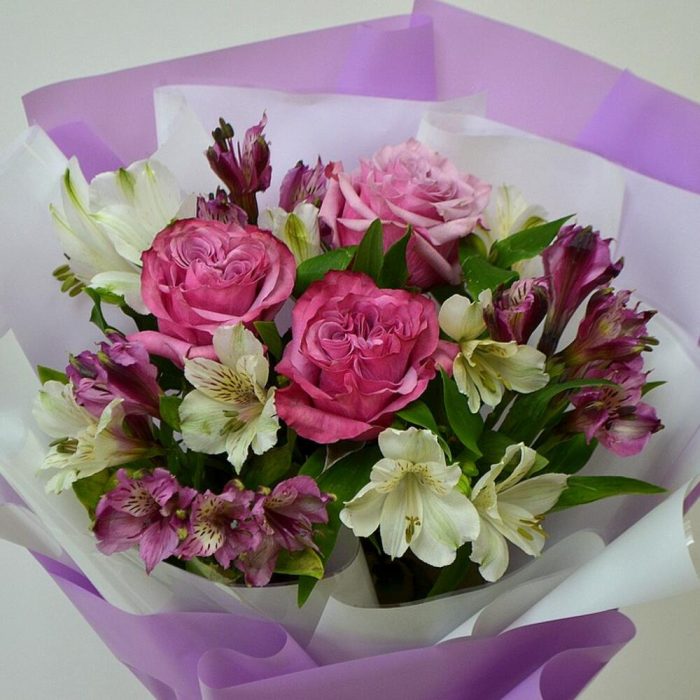 розы пионовидные – 3 шт.Альстромерия – 7 шт.декоративная упаковка – 1 шт.