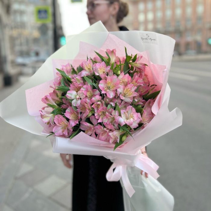 Альстромерия – 15 шт.Лента атласная – 1 шт.Тишью – 2 шт.Пленка матовая – 2 шт.