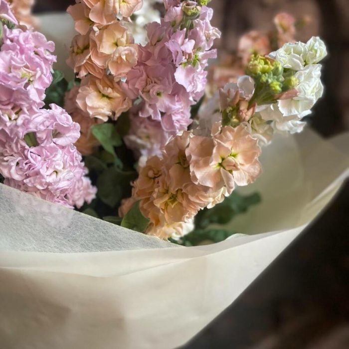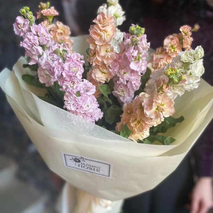 Букет из 9 разноцветных маттиол в стильной упаковке “Персиковый плен”