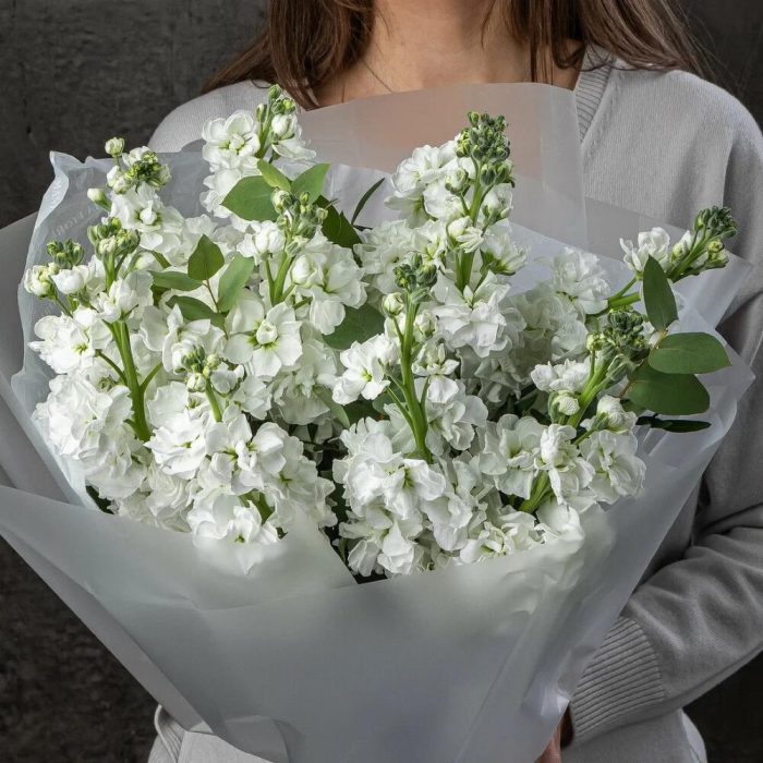 Маттиола – 11 шт.Эвкалипт – 1 шт.Подарочная упаковка – 1 шт.Средство продления жизни цветка – 1 шт.