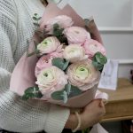 Букет розовых ранункулюсов и эвкалипта –