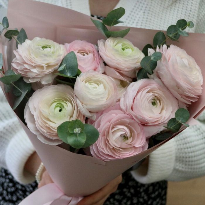 Букет розовых ранункулюсов и эвкалипта –