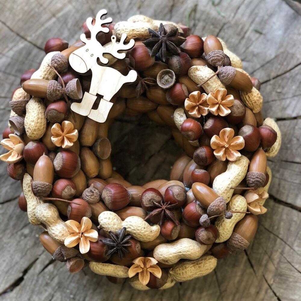 Основа для венка – 1 шт.желуди натуральные – 150 шт.орех фундук (200 гр.) – 1 шт.орех земляной – 45 шт.плоды эвкалипта – 10 шт.Бадьян натуральный – 5 шт.Игрушка деревянная – 1 шт.пленка прозрачная упаковочная – 1 шт.Пакет крафт – 1 шт.