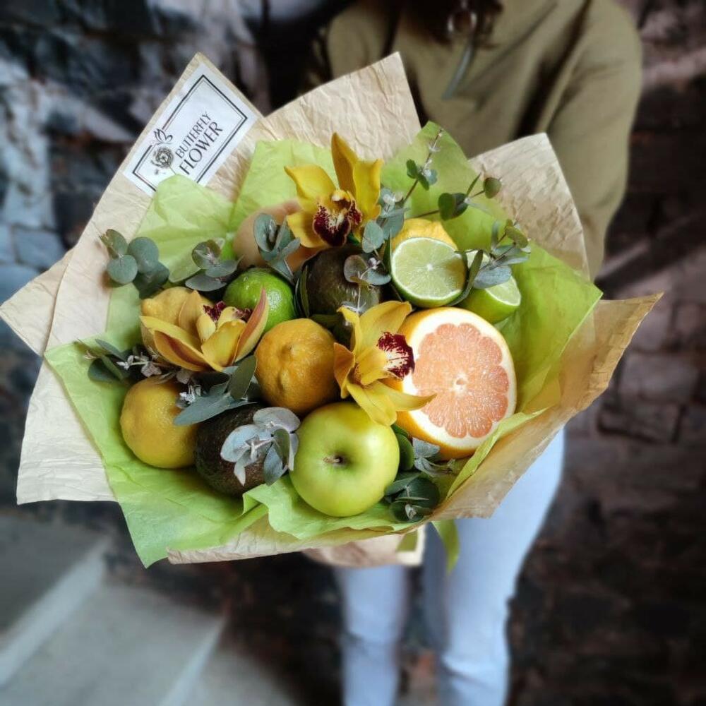 Эвкалипт – 5 шт.Лента атласная – 1 шт.Яблоко – 1 шт.Крафт – 1 шт.Лайм – 5 шт.Лимон – 4 шт.Авокадо – 2 шт.Грейпфрут – 1 шт.Цимбидиум зеленый – 3 шт.Айва – 1 шт.