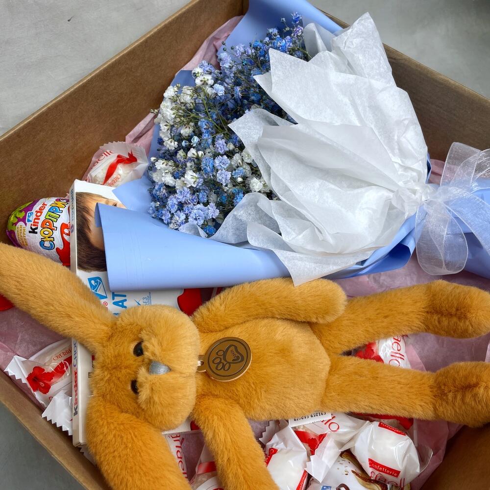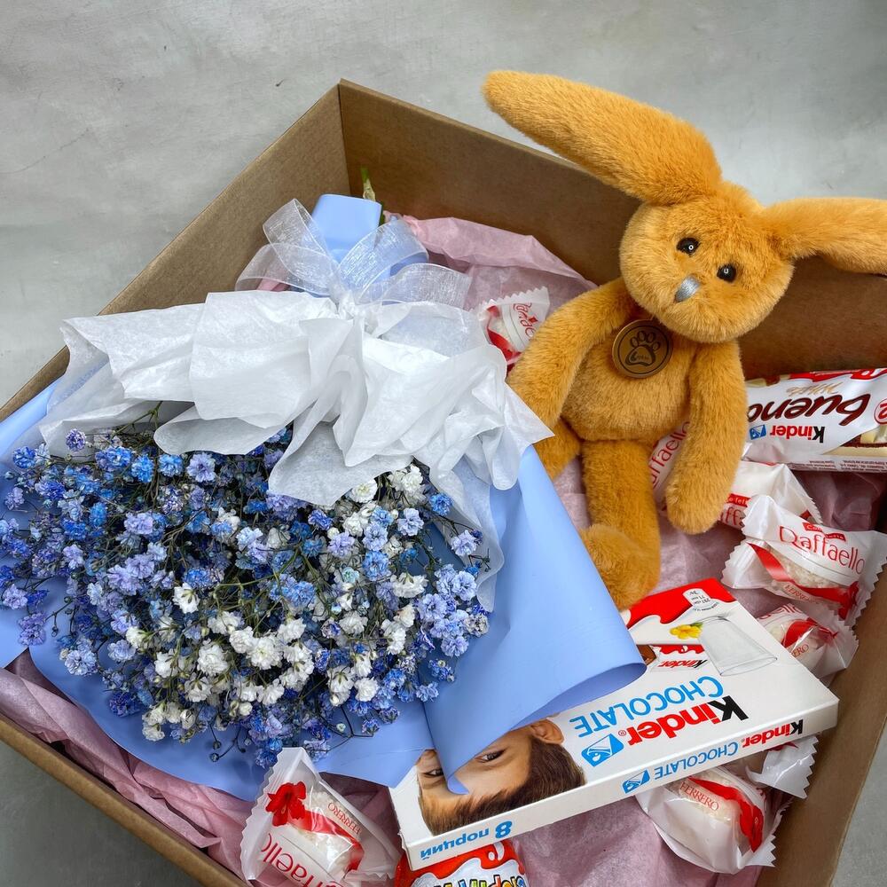 Гипсофила – 3 шт.Упаковка – 1 шт.Kinder bueno – 1 шт.Kinder сюрприз – 2 шт.Kinder chocolate – 1 шт.Raffaello конфеты – 10 шт.коробка крафт с окошком – 1 шт.игрушка зайчонок lapkin – 1 шт.