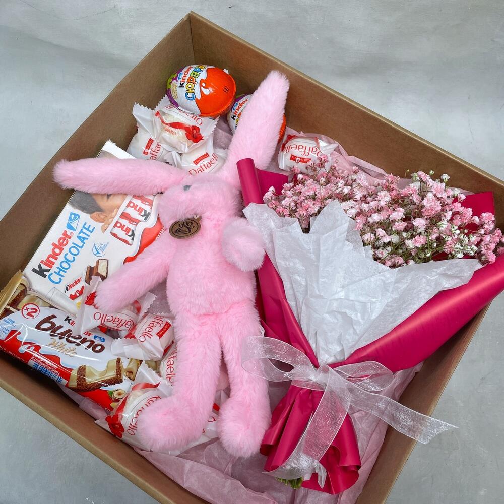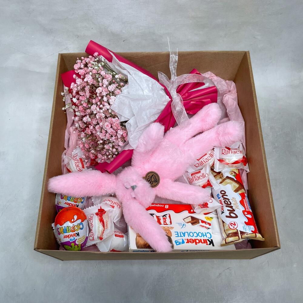 Гипсофила – 3 шт.Упаковка – 1 шт.Kinder bueno – 1 шт.Kinder сюрприз – 2 шт.Kinder chocolate – 1 шт.Raffaello конфеты – 10 шт.коробка крафт с окошком – 1 шт.