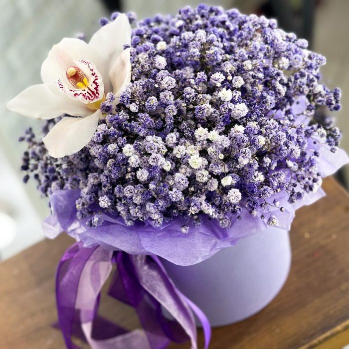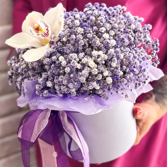 “Сиреневый туман” – композиция из гипсофилы в шляпной коробке