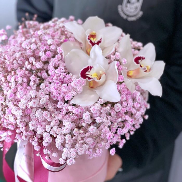 Гипсофила с орхидеей в коробке