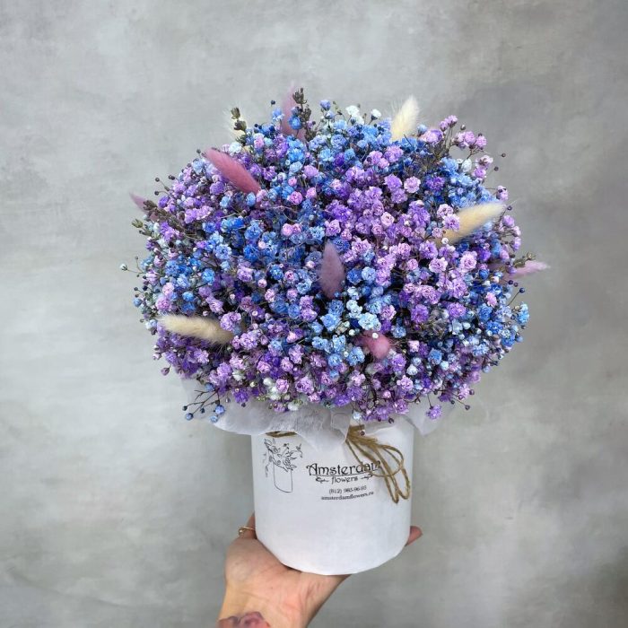 “Сиреневый туман” – композиция из гипсофилы в шляпной коробке