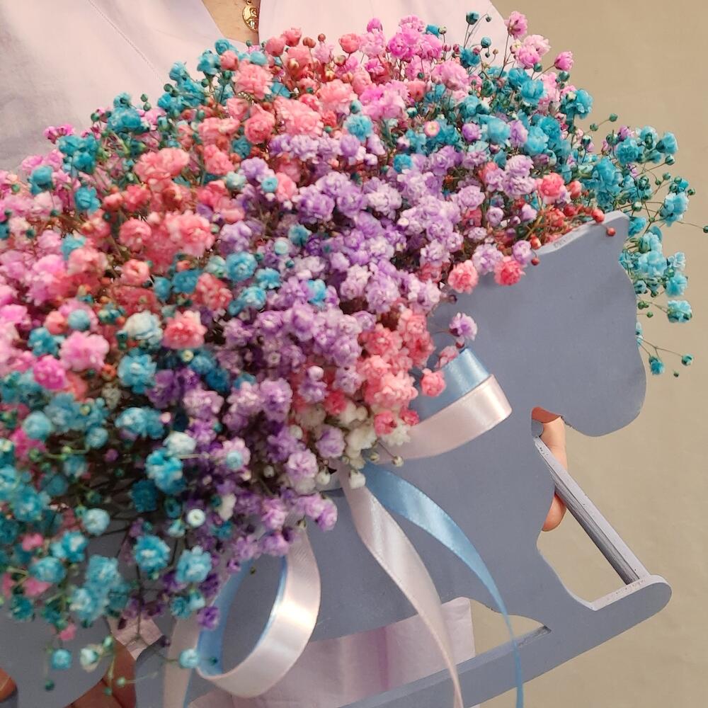 гипсофила радужная – 7 шт.Оазис флористический – 1 шт.Ящик деревянный – 1 шт.Лента атласная – 2 шт.