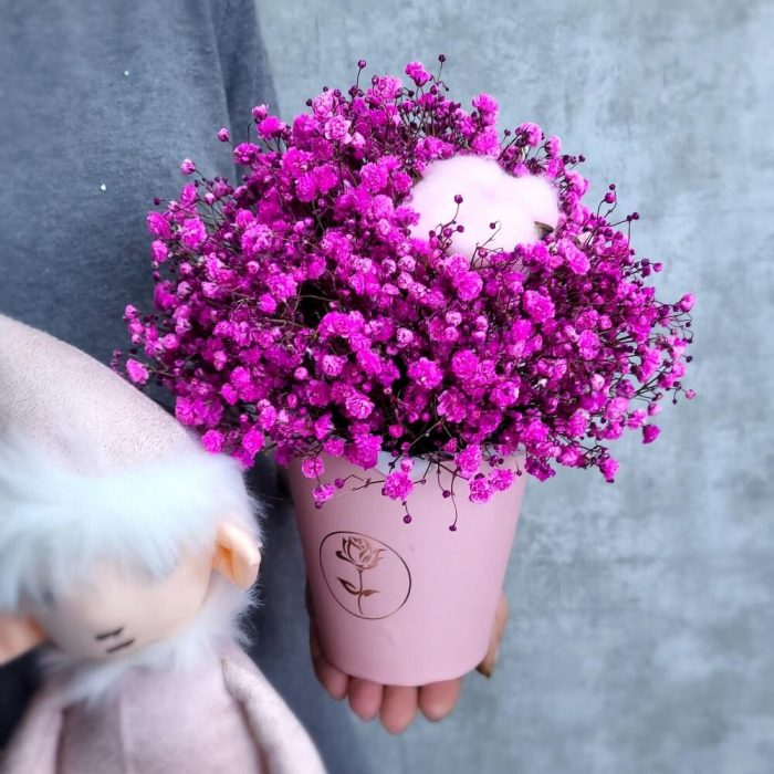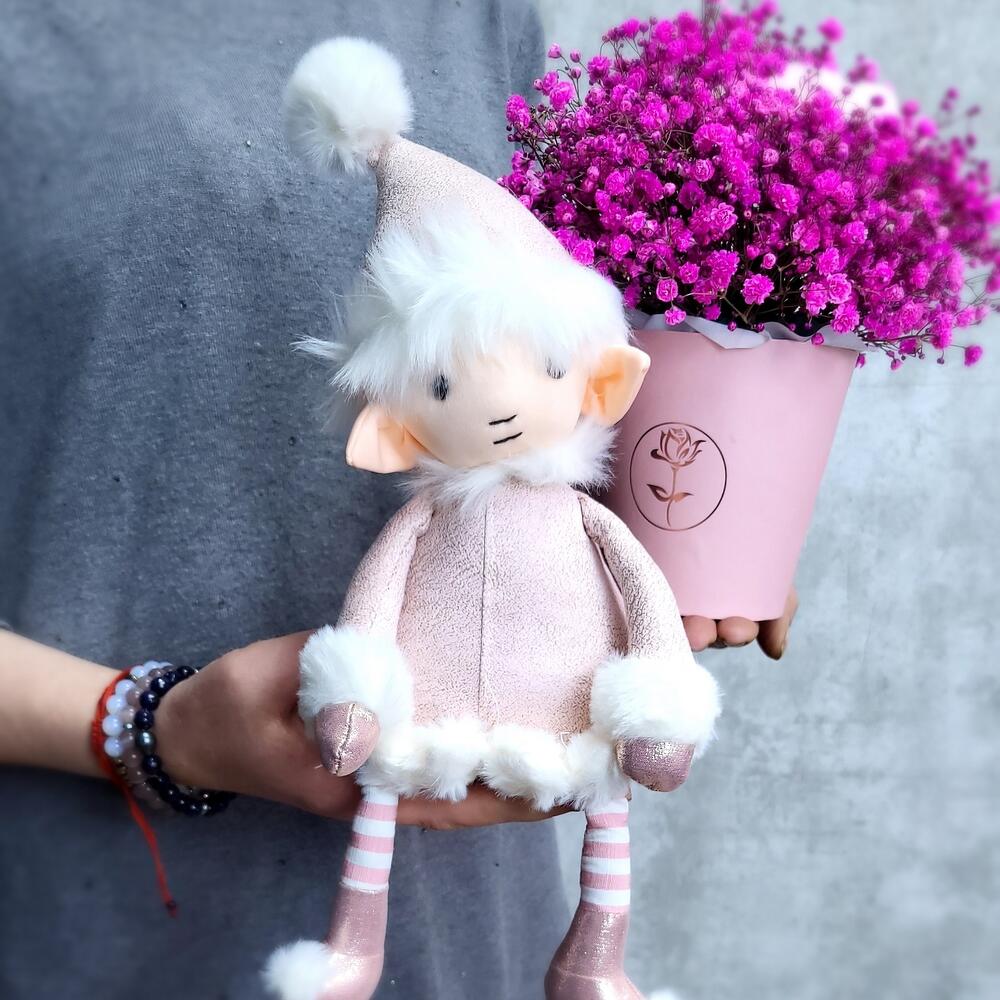 Милый эльф со стаканчиком пушистой гипсофилы