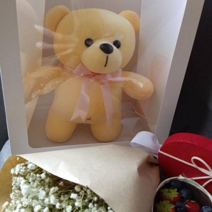 Гипсофила – 3 шт.Клубника – 250 гр.Лента атласная – 1 шт.Голубика – 100 гр.Крафт упаковка – 1 шт.Пакет подарочный – 1 шт.Мишка плюшевый – 1 шт.коробка сердце маленькая – 1 шт.