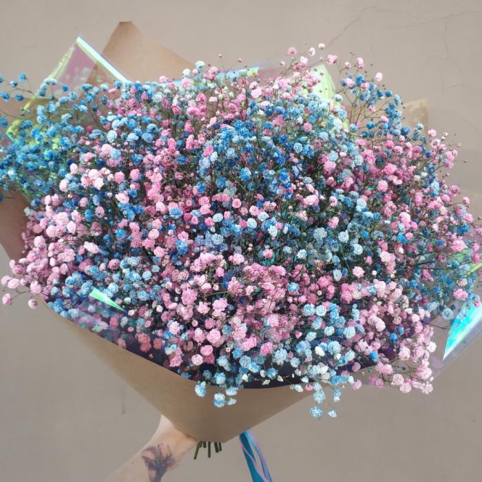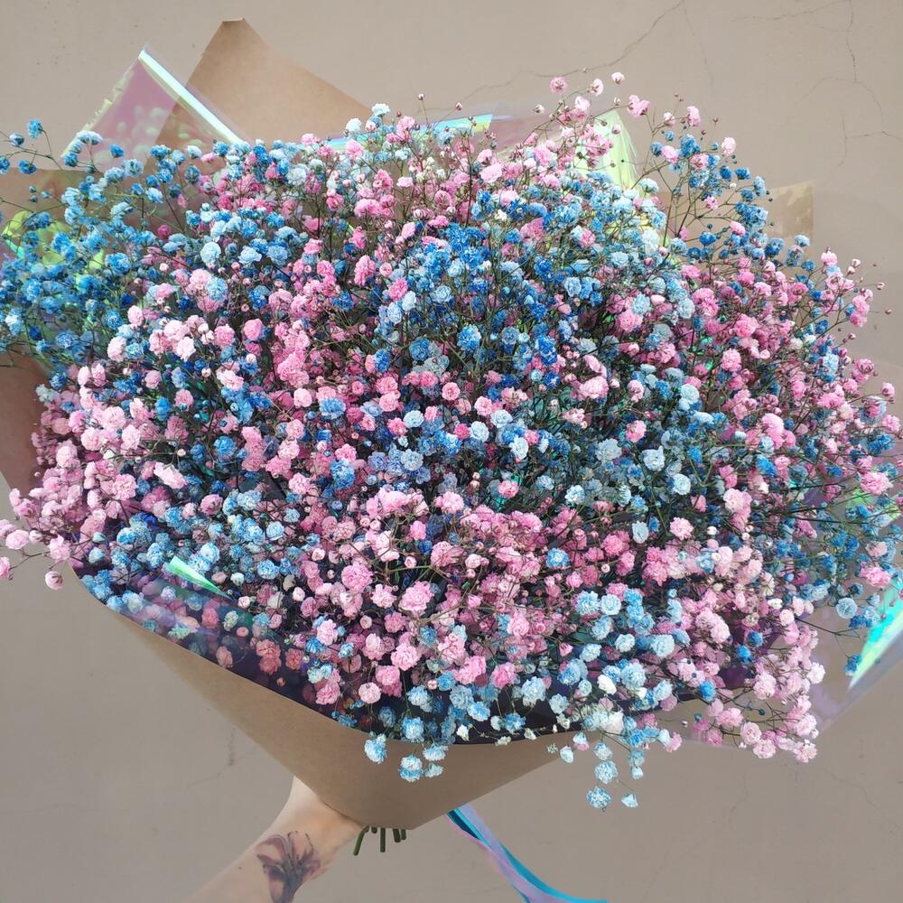 Микс яркой голубой и розовой гипсофилы в минималистичном крафте. Один из принципов нашей мастерской состоит в использовании минимального количества упаковки, ведь мы дарим цветы, а не бумагу Так акцент остаётся именно на цветах – таких красивых и нежных цветочков гипсофилы.