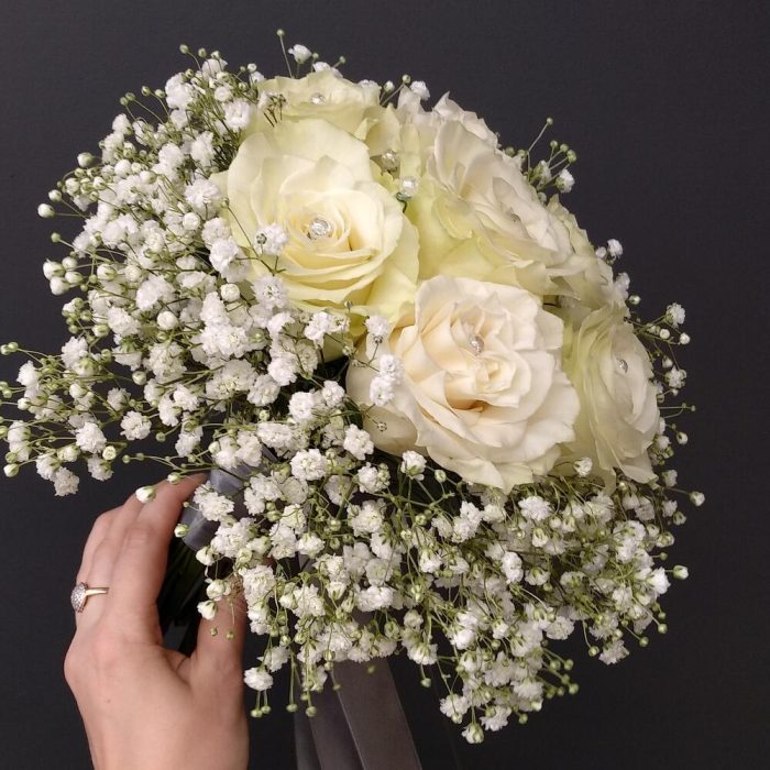 розы мондиаль – 7 шт.гипсофила белая – 4 шт.Лента атласная – 1 шт.бусины – 11 шт.
