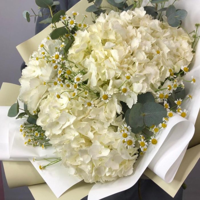 Гортензия – 3 шт.Матрикария – 6 шт.Эвкалипт – 3 шт.Корейская упаковка – 2 шт.бант атласный – 1 шт.