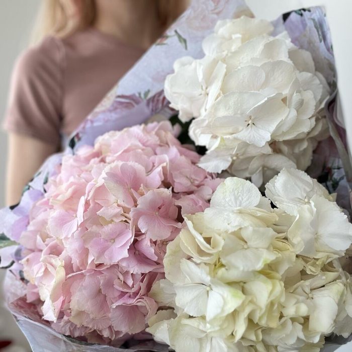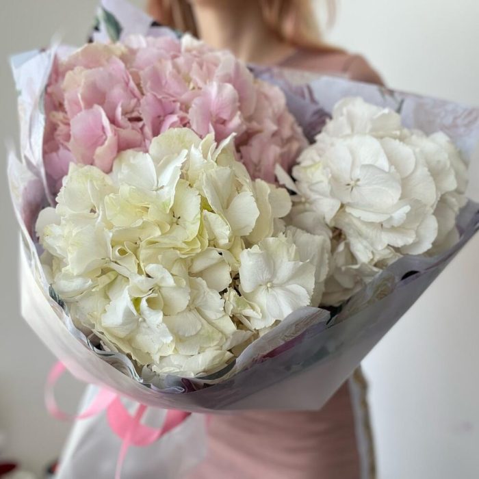Упаковка – 1 шт.Лента атласная – 1 шт.Тишью – 1 шт.гортензия голландия – 3 шт.