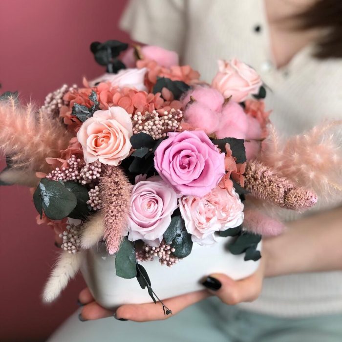 Хлопок – 5 шт.Керамическое кашпо – 1 шт.гортензия стабилизированная – 20 гр.рисовый цветок – 2 шт.стабилизированные цветы микс – 21 шт.