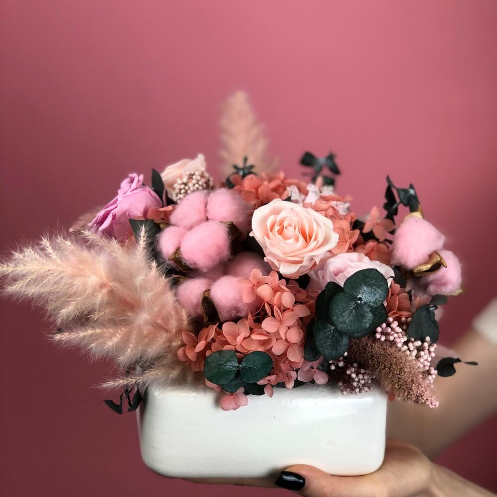Композиция авторская из стабилизированых цветов. Ваза керамическая.Не требует ухода и полива, срок жизни 5-7 лет при соблюдении рекомендаций.