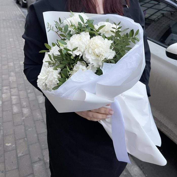 Лента атласная – 1 шт.Диантус – 9 шт.Пленка матовая – 4 шт.Фисташка пучок – 1 шт.Тишью белое – 4 шт.
