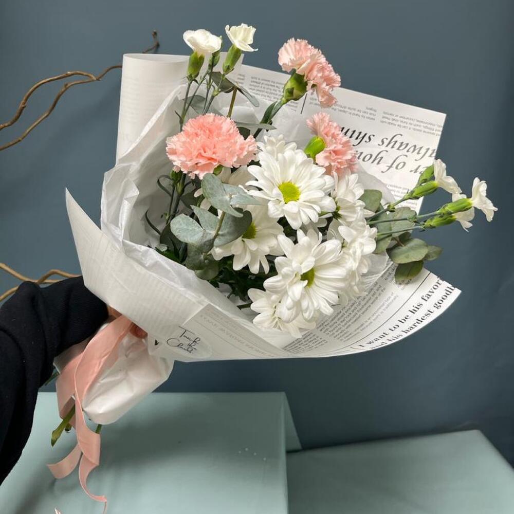 Букет «Нежность» с кустовыми гвоздиками, кустовой хризантемой и гвоздиками