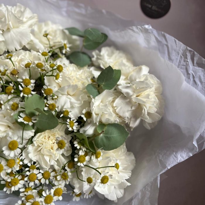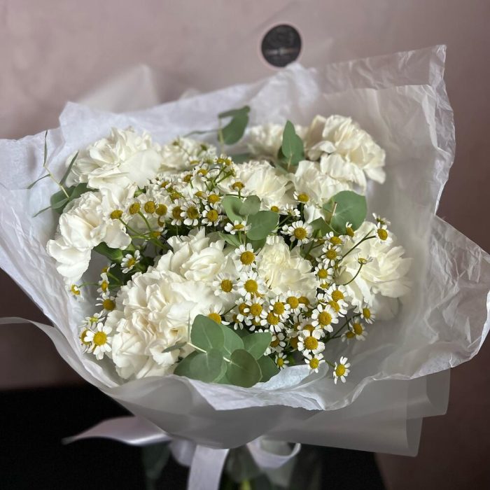 Диантус – 13 шт.Танацетум – 3 шт.Эвкалипт – 1 шт.декоративная упаковка – 1 шт.Атласная лента – 1 шт.
