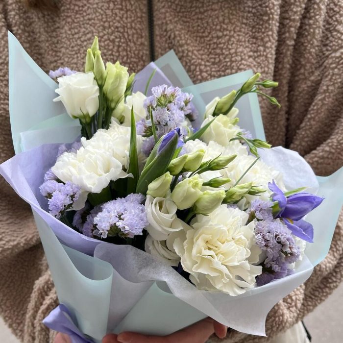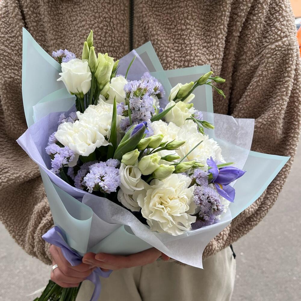 Диантус белый – 8 шт.Ирис синий – 3 шт.лизиантус эустома белый – 2 шт.Статица фиолетовая – 2 шт.Упаковка дизайнерская – 2 шт.
