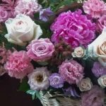 Корзина с пионами,маттиолой и пионовидными розами