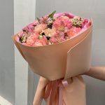 Диантус – 6 шт.Хамелациум – 1 шт.Роза кустовая – 3 шт.Рускус сочи – 5 шт.Альстромерия – 3 шт.Тишью – 2 шт.Фоамиран (упаковка) – 2 шт.Лента атласная – 2 шт.