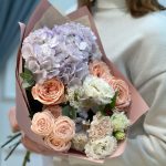 Красивый букет с гортензией и пионовидными розами