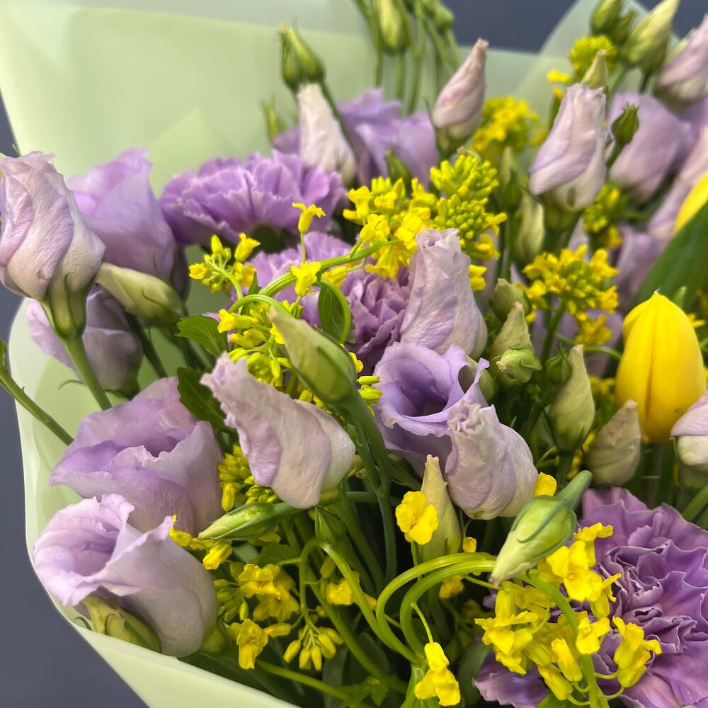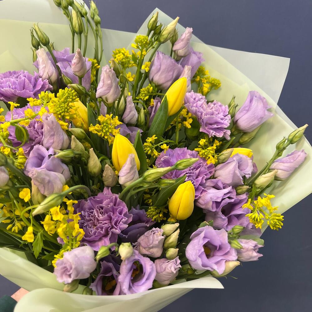 Тюльпан желтый – 5 шт.Лизиантус лавандовый – 5 шт.Диантус лунный – 5 шт.Лента атласная желтая – 1 шт.Лента атласная фиолетовая – 1 шт.упаковка корейская пленка мятная – 1 шт.экзотика зелень желтая – 10 шт.