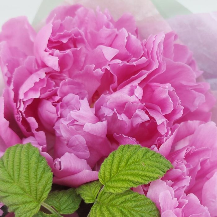 Пион – 3 шт.Хризантема кустовая – 1 шт.Гвоздика кустовая – 2 шт.Упаковка дизайнерская – 1 шт.рубус зелень – 1 шт.