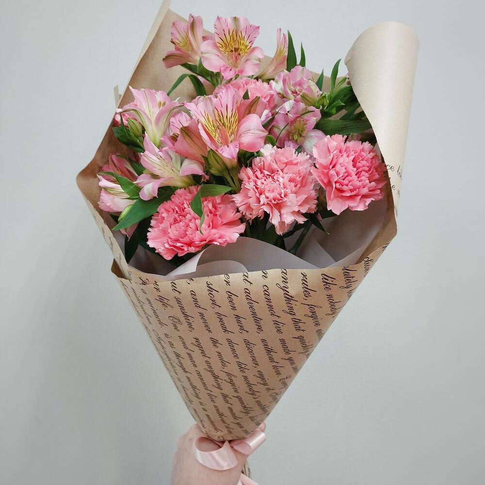 Альстромерия – 5 шт.Лента атласная – 1 шт.Диантус – 5 шт.Авторская упаковка – 1 шт.