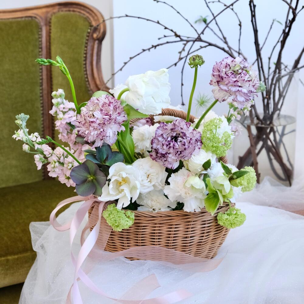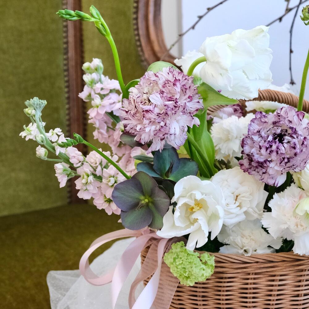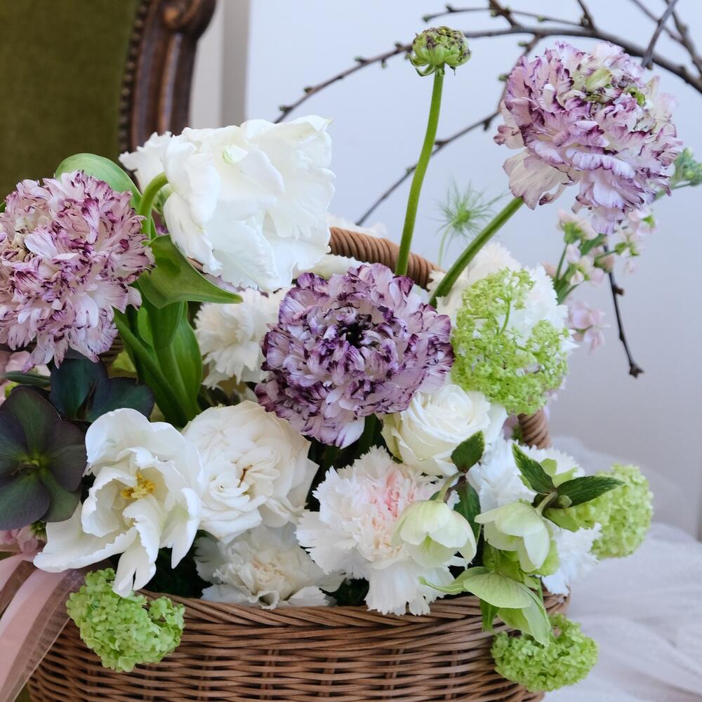 Гвоздика – 6 шт.Корзина плетеная – 1 шт.вибурнум Розеум (Калина зеленая) – 1 шт.Лизиантус Алиса белый – 1 шт.Оазис флористический – 1 шт.Хелеборус (морозник) – 1 шт.Мох стабилизированный – 1 шт.Тюльпан попугайчик – 2 шт.маттиола сиреневая – 3 шт.ранункулюс пон пон – 4 шт.