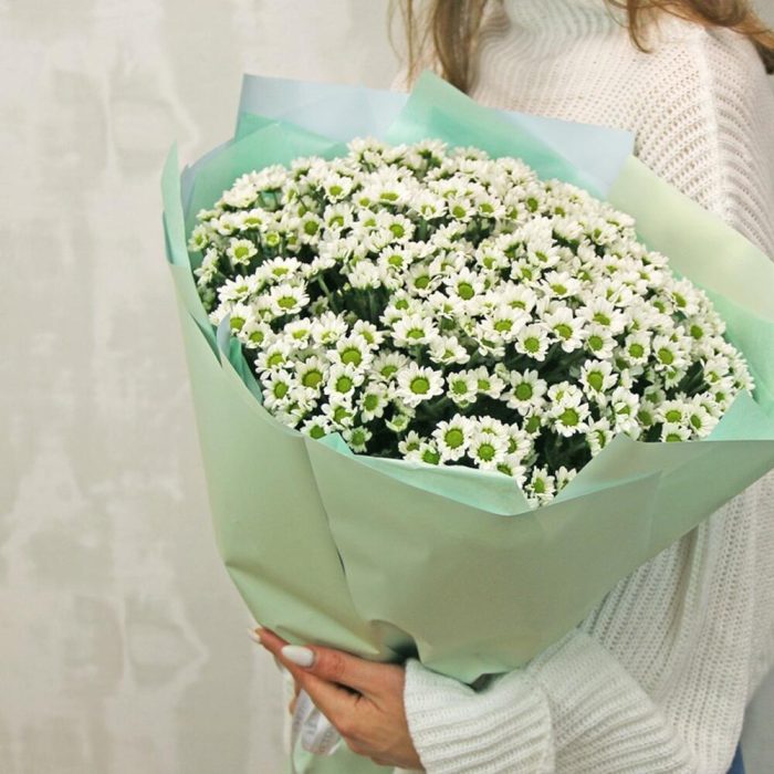 Букет из 25 белых кустовых хризантем Сантини в стильной упаковке
