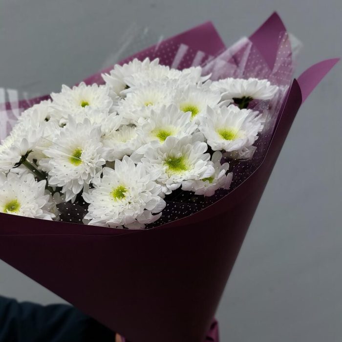 Хризантема кустовая белая – 7 шт.Упаковка дизайнерская – 2 шт.Лента атласная – 1 шт.