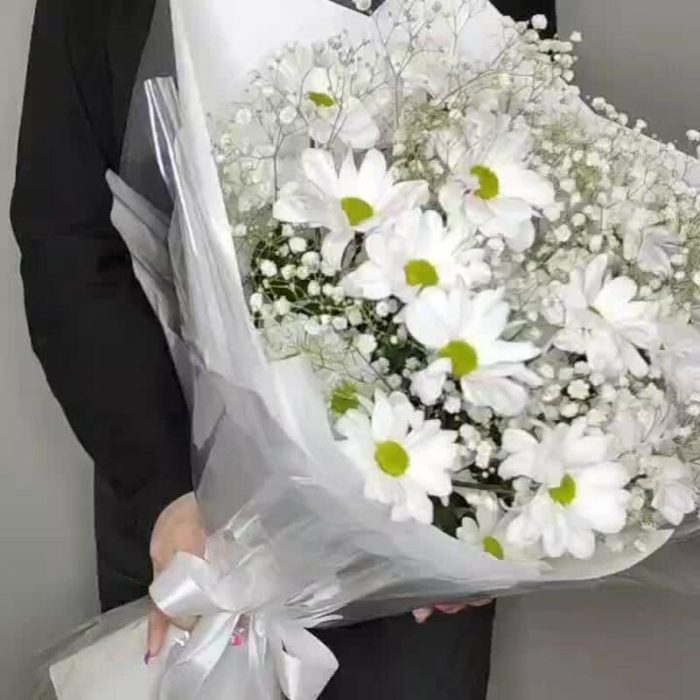 Букет из белоснежных ромашек и воздушной гипсофилы “Ромашки в снегу”