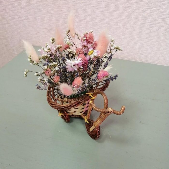 Лаванда (сухоцвет) – 20 шт.гелихризум (сухоцвет) – 10 шт.Лагурус (сухоцвет) – 5 шт.Лимониум – 1 шт.Оазис флористический – 1 шт.велосипед декоративный – 1 шт.
