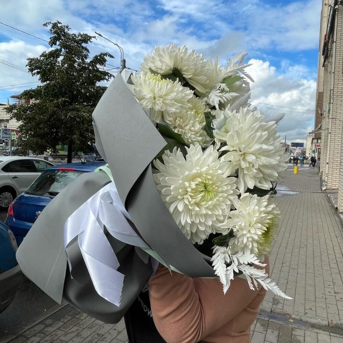 Моно букет из хризантем в дизайнерском оформлении
