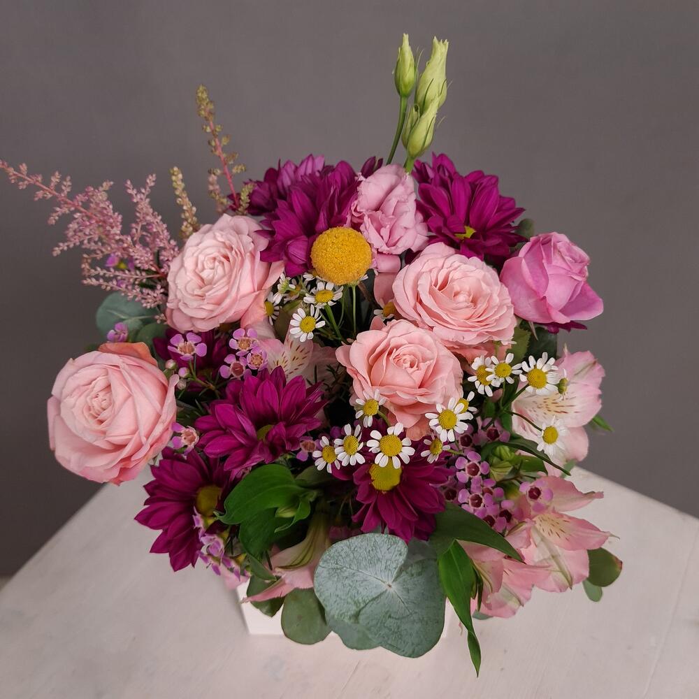 Альстромерия – 1 шт.Астильба – 3 шт.Ваксфлауэр – 1 шт.Краспедия – 1 шт.Хризантема кустовая – 1 шт.Эвкалипт – 2 шт.Эустома – 1 шт.Ромашка кустовая – 1 шт.Коробка – 1 шт.губка флористическая с водой – 1 шт.