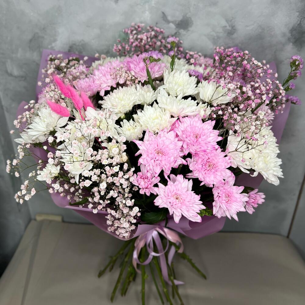 Хризантема кустовая – 13 шт.Статица – 2 шт.гипсофила радужная – 3 шт.Лагурус (сухоцвет) – 5 шт.Упаковка дизайнерская – 2 шт.Лента атласная – 2 шт.