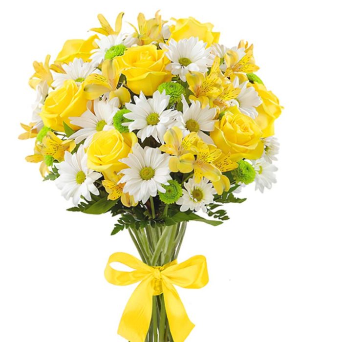 Папоротник – 1 шт.хризантема кустовая (белый) – 5 шт.альстромерия (желтый) – 5 шт.лента атласная (желтый) – 1 шт.