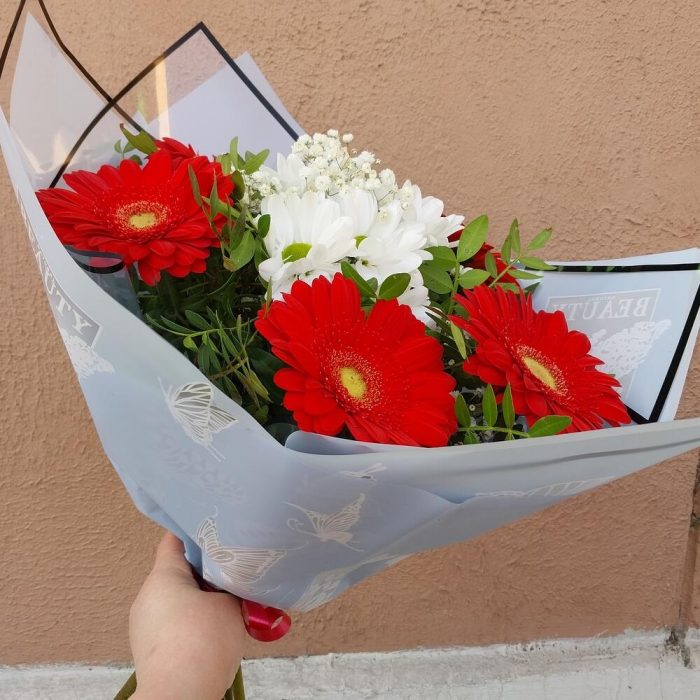 Гипсофила – 1 шт.Гербера – 5 шт.Фисташка – 10 шт.Упаковка дизайнерская – 3 шт.бакарди ромашка хризантема кустовая – 1 шт.