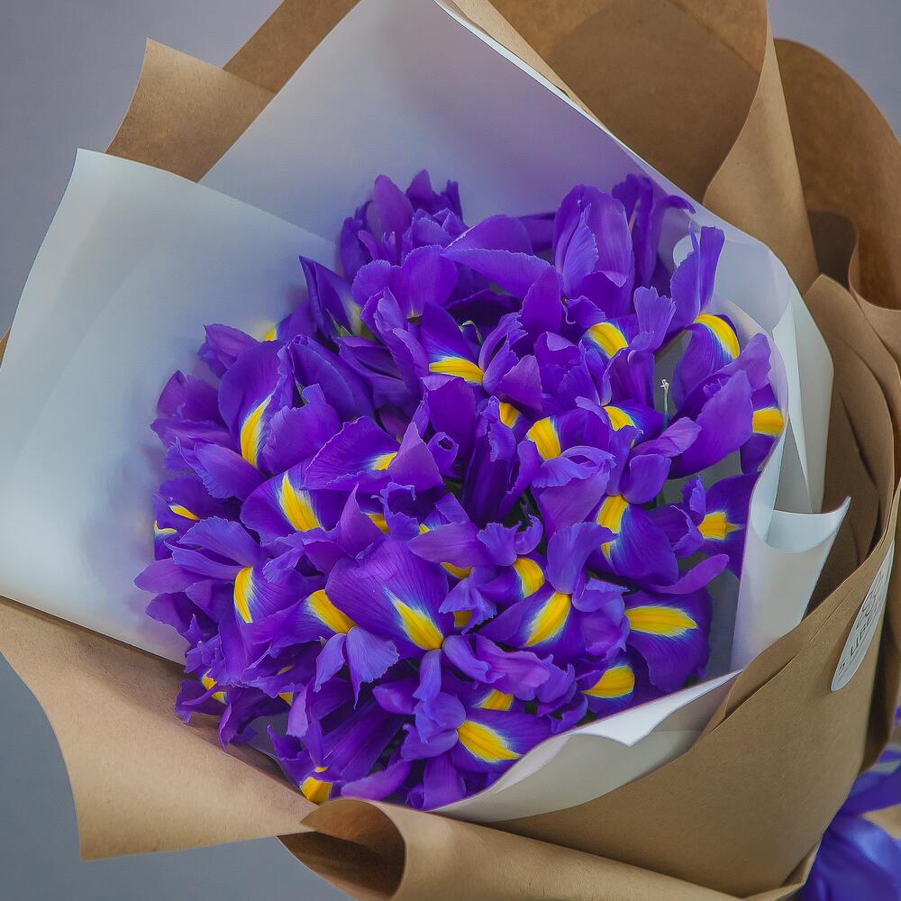 ирисы синие – 19 шт.Упаковка крафт – 1 шт.Атласная лента – 1 шт.