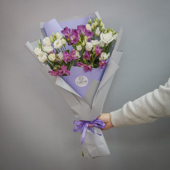 Альстромерия – 3 шт.Упаковка – 1 шт.Атласная лента – 1 шт.эустома белая – 5 шт.
