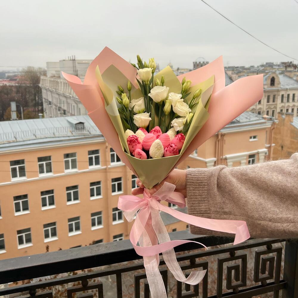 Букет из клубники в шоколаде с розовыми розами
