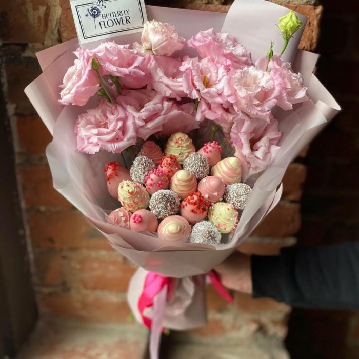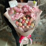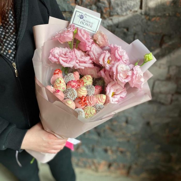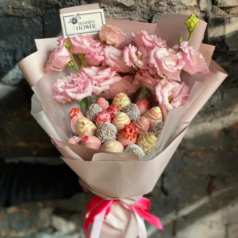 Съедобный букет из клубники в шоколаде и кустовых роз в шляпной коробке