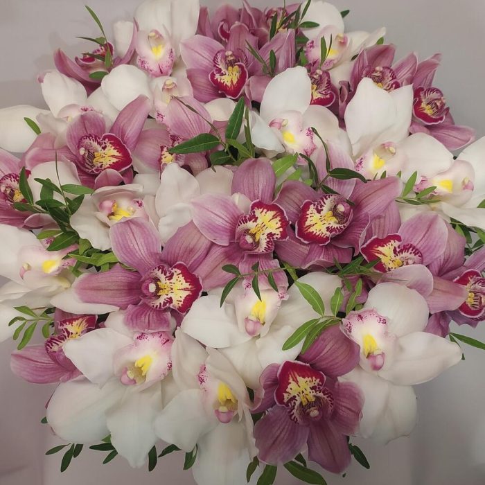 Орхидея Цимбидиум ветка – 2 шт.Коробка шляпная – 1 шт.Фисташка пучок – 1 шт.Оазис флористический – 2 шт.бант атласный – 1 шт.