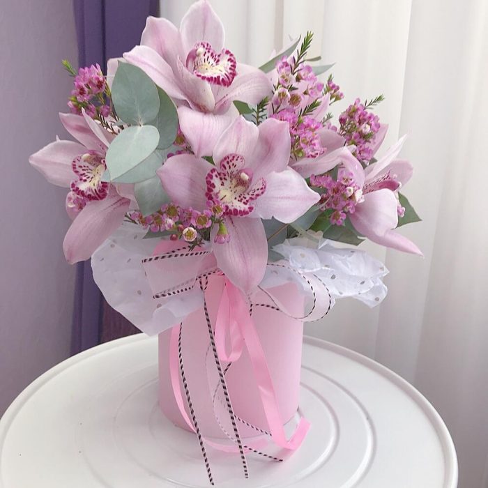 Нежная композиция из розовых орхидей и эвкалипта