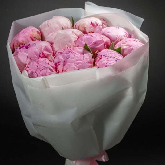 пионы розовые – 11 шт.Упаковка дизайнерская – 2 шт.Лента атласная – 2 шт.Открыточка с вашими пожеланиями – 1 шт.инструкция по уходу за цветами – 1 шт.хорошее настроение – 100 шт.