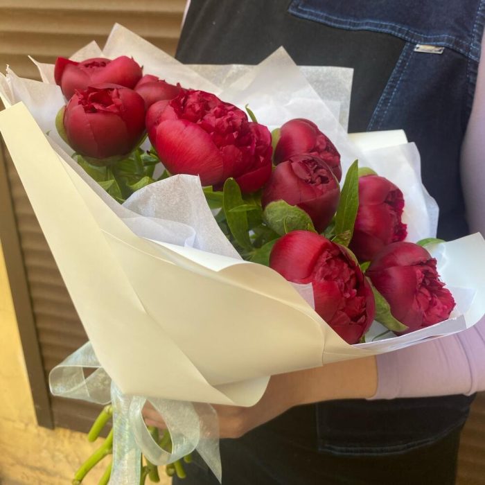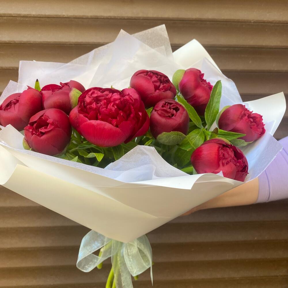 Пион – 9 шт.Лента атласная – 1 шт.Упаковка дизайнерская – 2 шт.Тишью белое – 2 шт.